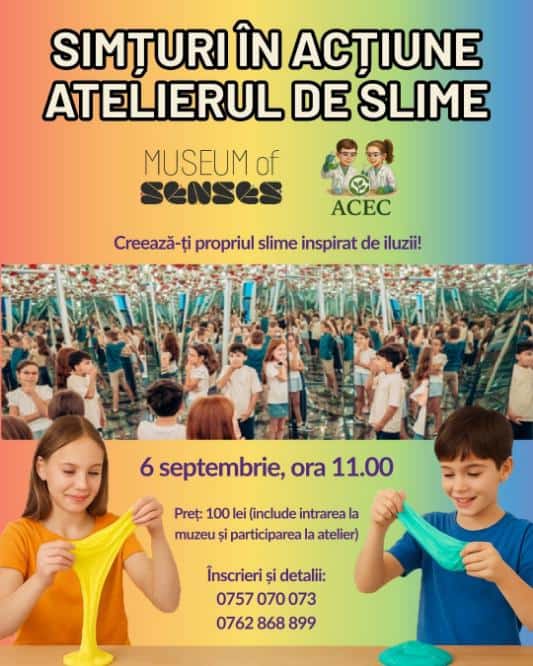 Museum of Senses te invită la un eveniment inedit unde știința, joaca și descoperirea se împletesc într-o călătorie a simțurilor! După o aventură captivantă prin lumea iluziilor de la Museum of Senses Bucharest, continuăm distracția cu un atelier creativ de slime la care copiii își vor pune la treabă simțul tactil, vizual și chiar mirosul.