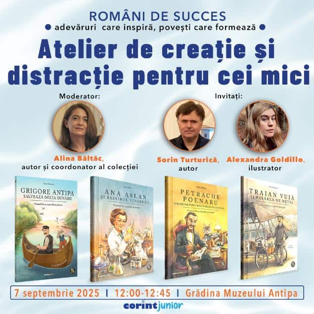 - Întâlnire cu autorul Sorin Turturică și atelier creativ cu ilustratoarea Alexandra Goldillo la scena din Grădina Muzeului, la ora 12:00.