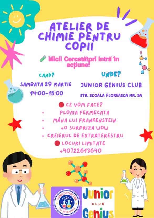 Dragi părinți, pregătiți-i pe cei mici pentru o aventură spectaculoasă în lumea științei! Copiii vor deveni mici oameni de știință și vor descoperi cum magia și chimia se împletesc în experimente fascinante.