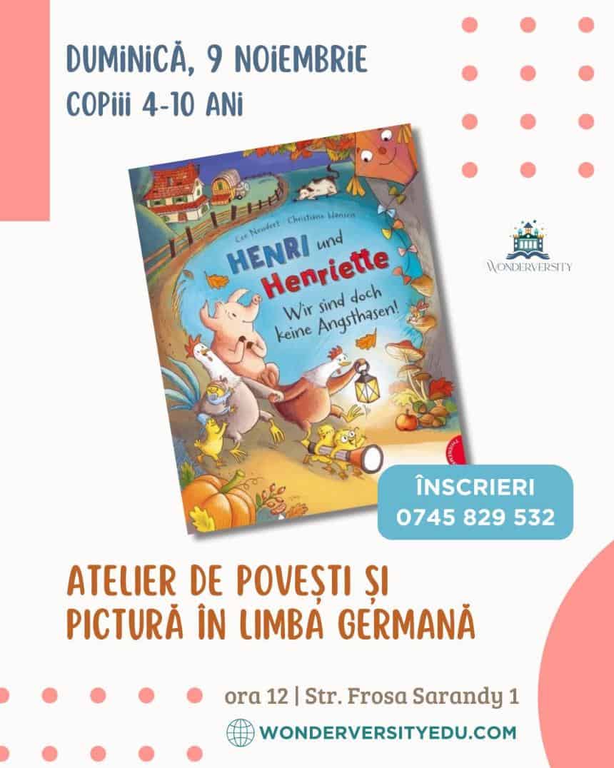 Este vremea recoltei și, deși gospodăria e plină de treburi, un puișor îl roagă pe Henri să-i citească o poveste cu un monstru. Tatăl nu poate refuza — dar ce se întâmplă când chiar el ajunge să se teamă de orice? Inspirată din cartea „Wir sind doch keine Angsthasen!” din seria „Henri und Henriette”, activitatea spune o poveste despre învingerea fricilor, sprijinul familiei și micile bucurii ale toamnei. Copiii vor descoperi că emoțiile pot fi prietene, iar curajul se învață pas cu pas.