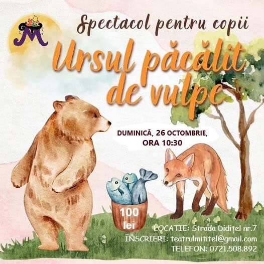Duminică cei mici sunt invitați la „Ursul păcălit de vulpe”, un spectacol-atelier vesel și jucăuș, recomandat copiilor 1–7 ani. Povestea clasică prinde viață cu rime, joc și participarea copiilor, iar la final transformăm aventura în joacă creativă. Activitate practică: fiecare copil decorează un pește, „pescuim” și ne jucăm cu recuzita.