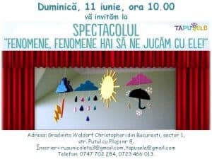 Tapusele ne invita pe 11 iunie incepand cu ora 10:00 la spectacol senzorial pentru copii 4-6 ani numit Fenomene, fenomene hai, să ne jucăm cu ele!