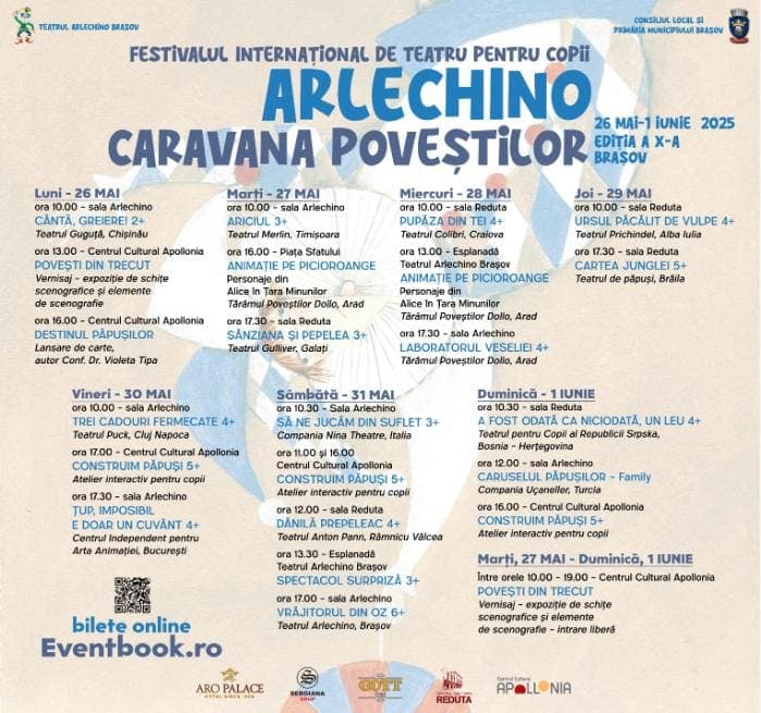 – de la ora 13.00 – Vernisajul expoziției „Povești din trecut” – schițe artistice și elemente de scenografie din arhiva Teatrului pentru Copii „Arlechino”. Expoziția aduce în prim-plan universul vizual al spectacolelor care au încântat generații de spectatori, oferind o incursiune emoționantă în istoria teatrului.