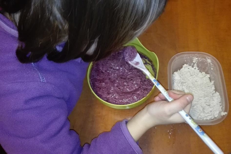 Se lasa la inmuiat tot amestecul ideal intre 30-60 minute, ca sa aiba timp suficient sa se umfle semintele de chia. Trebuie sa iasa o pasta moale, care curge. Dar se poate manca si dupa 15-20 minute. Sau dupa reteta Soniei, imediat: adica ea manca in timp ce amesteca chia cu pasta de fructe. Dupa cum ziceam, nu te pui cu gusturile copiilor 🙂