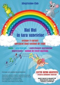 Din 3 august incepem o noua grupa a modulului “Hai-hui in tara sunetelor”, un curs ce include elemente din mai multe domenii: canto, teatru, improvizatie, teorie muzicala, arts&crafts. Pe parcursul celor 8 sedinte ne vom juca pe ritmurile Allegrissimo ghidati de Metronom, experimentand diverse feluri de instrumente si modalitati de producere a sunetelor, formand o mica orchestra. In acest fel, fiecare copil va avea posibilitatea de a o dirija, iar ceilalti se vor adapta, aplicand elementele teoretice invatate, la cererea micului dirijor.