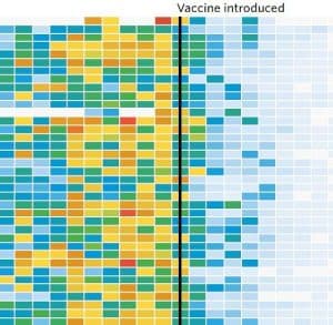 Statistica acopera mai mult de 70 de ani si arata modul in care numarul de incidente scade vertiginos dupa introducerea vaccinarii.
