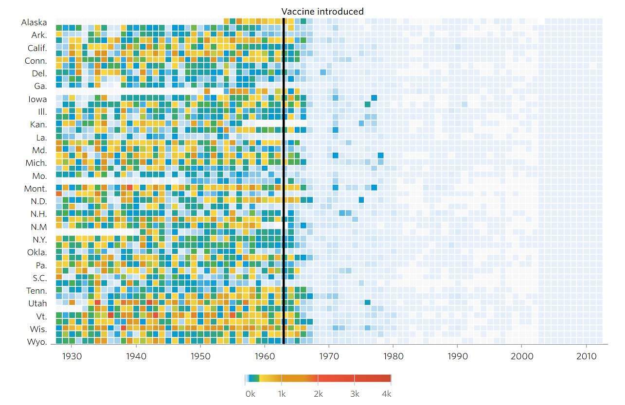 Wall Street Journal a publicat o serie de grafice care arata efectele campaniilor de vaccinare pentru o serie de boli. Acestea un avut efect benefic evident prin reducerea incidentei ulterioare a bolilor in Statele Unite: pojar, hepatita A, oreion, pertusis (tuse convulsivă), poliomielita, rubeola, variola.