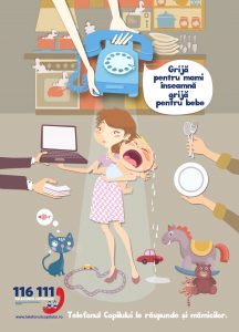 Fiecare mamă știe că bebelușul său are nevoie de ea permanent, dar și că soțul sau are nevoie de ea, că trebuie să se ocupe în continuare de treburile casnice, iar în același timp i se cere să se întoarcă mai repede la birou. Așa încât trebuie să facă față cumva tuturor acestor nevoi, chiar dacă uneori simte că e la capătul puterilor. Telefonul Copilului 116 111 vine să o asculte și să-i ofere sfaturile de care are nevoie pentru a trece mai ușor prin perioada de acomodare. La Telefonul Copilului 116 111 răspund asistenți sociali și psihologi pregătiți să răspunda tuturor situațiilor legate de problemele cu care se confruntă copiii.