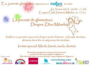 Tema primei noastre întîlniri este Zâna Măseluță, pe care o vom aborda cu Mirela Istrati, medic dentist cu experiență în acest tărâm de basm. Cu alte cuvinte vom afla mai multe despre primii dințișori, igienă dentară, alinarea durerilor micuților și nu în ultimul rând cum să creștem interesul ghemotocilor pentru sănătatea dințișorilor.Participarea este GRATUITĂ pe bază de înscriere la adresa de mail: [email protected]!