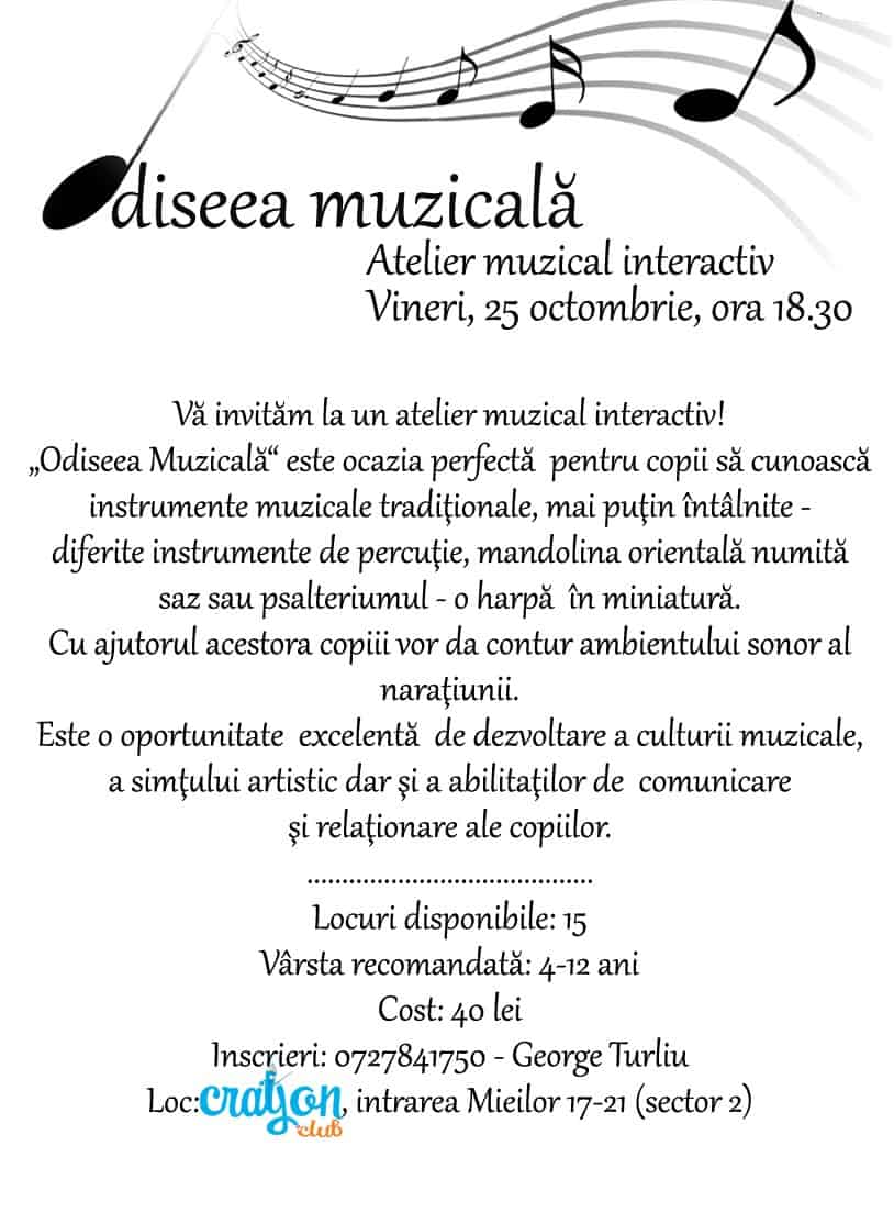 „Odiseea muzicala” este ocazia perfecta pentru copii sa cunoasca instrumente muzicale traditionale, mai putin intalnite – diferite instrumente de percutie, mandolina orientala numita saz sau psalteriumul – o harpa in miniatura. Cu ajutorul acestora copiii vor da contur ambientului sonor al naratiunii. Este o oportunitate excelenta de dezvoltare a culturii muzicale, a simtului artistic dar si a abilitatilor de comunicare si relationare ale copiilor.