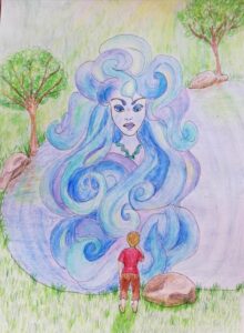 Mișcarea de apă se apropia cu rapiditate de el, crescând în dimensiuni. Când ajunse foarte aproape de mal, se învolbură cu spumă și continuă să se ridice pe verticala, ca un zid. Cu ochii măriti și gura căscata, băiatul își dădu capul pe spate ca să poată privi în continuare. Spaima i se citea pe chip, căci el se aștepta ca în orice moment valul imens să se prăbușească peste el și să îl înghită. Însă zidul de apă începu apoi să prindă forma unei femei frumoase, cu corpul străveziu și păr lung, ondulat. Lumina soarelui părea prinsă în acea formă și totul sclipea amețitor, făcând aproape imposibil să privești timp îndelungat. Băiatul începu să lăcrimeze de atâta strălucire.