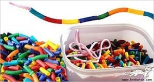 Vom incepe joaca de sambata cu pictura ud pe ud. Pentru ca este o experienţă artistică specială, în care nu căutam forma ci lăsăm copilul să descopere culoarea. Se folosesc acuarele speciale; culorile umede pe hârtie umedă se combina într-un mod neaşteptat şi frumos. E ca o magie! Hai să-i lăsăm pe copii să o descopere pentru ei înşişi, iar voi părinţi să vă alaturi de ei. (20 min) Apoi din paste colorate, punem una cât una pe fir înşirate.. ne facem un colier, o brăţară, un cordon sau cordeluţa.. sau chiar o coadă de pisicuţa??!! (25 min)