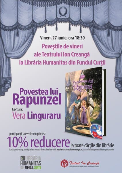 Vineri, 27 iunie, ora 18:30, la Librăria Humanitas din Fundul Curții (Calea Victoriei, nr. 120), Teatrul Ion Creangă vă invită să pășiți afară din turn și să cunoașteți o lume magică prin intermediul uneia dintre cele mai încurcate aventuri – „Povestea lui Rapunzel”.