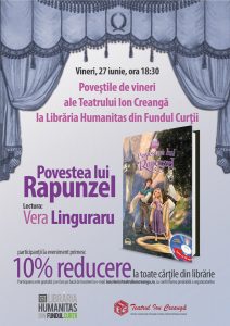 Vineri, 27 iunie, ora 18:30, la Librăria Humanitas din Fundul Curții (Calea Victoriei, nr. 120), Teatrul Ion Creangă vă invită să pășiți afară din turn și să cunoașteți o lume magică prin intermediul uneia dintre cele mai încurcate aventuri – „Povestea lui Rapunzel”.