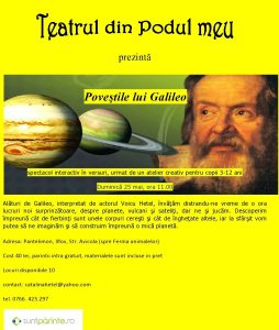 Alături de Galileo, interpretat de actorul Voicu Hetel, învăţăm distrandu-ne vreme de o ora lucruri noi surprinzătoare, despre planete, vulcani şi sateliţi, dar ne şi jucăm. Descoperim împreună cât de fierbinţi sunt unele corpuri cereşti şi cât de îngheţate altele, iar la sfârşit vom putea să ne imaginăm şi să construim împreună o mică planetă.