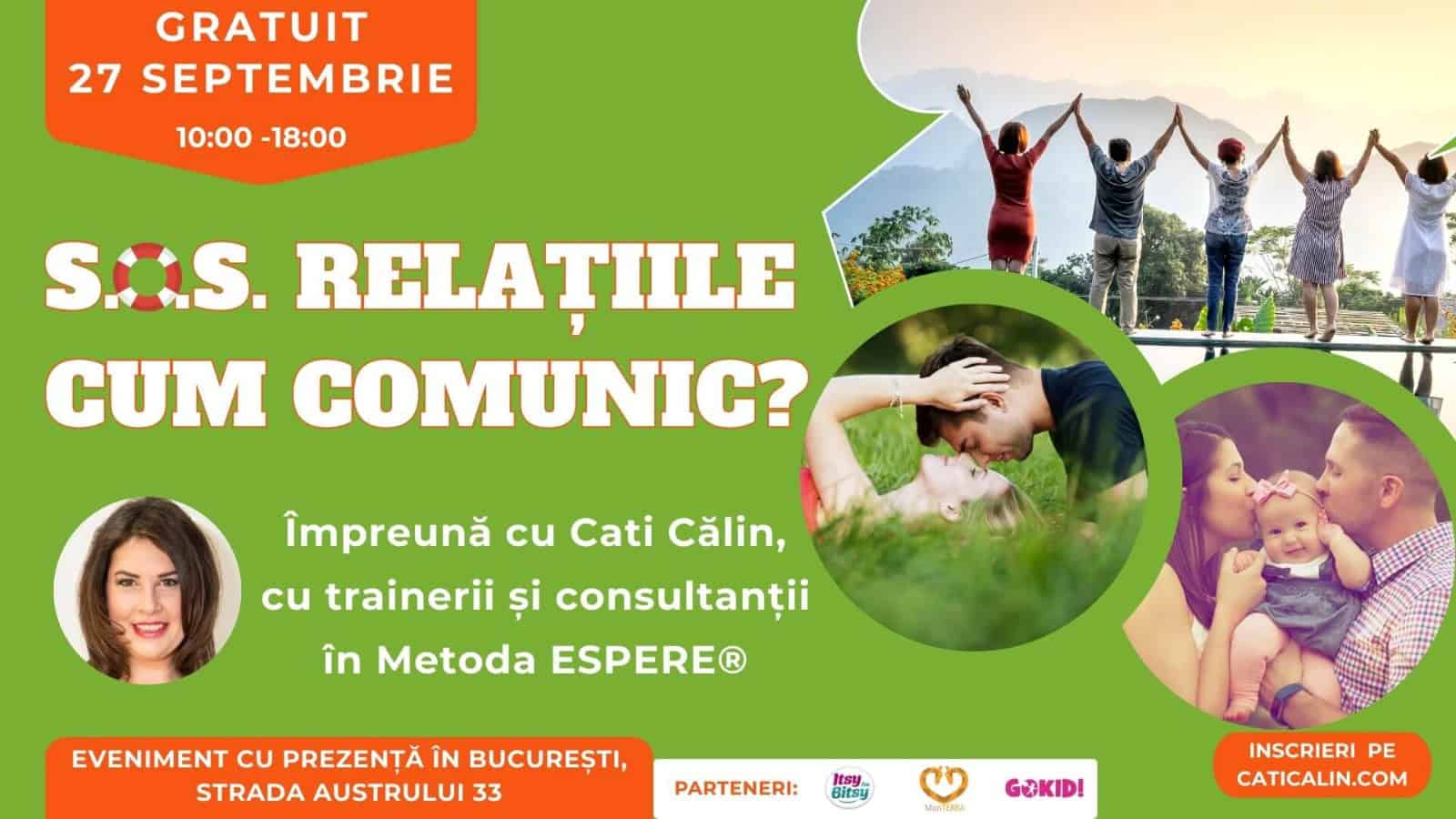 Într-o perioadă în care relațiile sunt tot mai puse la încercare și un adevărat flagel al omenirii este însingurarea, Cati Călin, Formatoarea de formatori în Metoda ESPERE® și o echipă de 6 traineri ESPERE invită publicul larg sâmbătă, 27 septembrie, la conferința S.O.S. relațiile. Cum comunic cu ajutorul Metodei ESPERE® pentru a avea relații împlinite, fie că vorbim despre o relație de cuplu, de părinte-copil, de familie sau profesională.