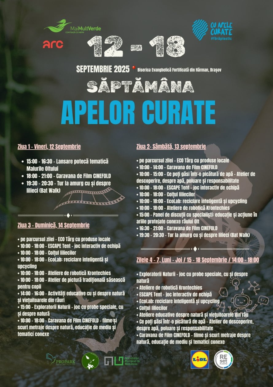 Între 12 și 18 septembrie 2025, zona metropolitană Brașov găzduiește Săptămâna Apelor Curate, un eveniment dedicat educației ecologice și implicării comunitare. Proiectul este organizat în cadrul inițiativei Oltul Curat – Rădăcini pentru Viitor, de către Propark – Fundația pentru Arii Protejate, alături de Societatea Română de Sălbăticie și Asociația Carpaterra, cu sprijinul programului Cu Apele Curate, susținut de Lidl România.