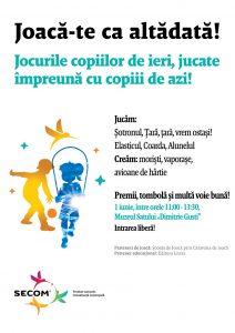 De Ziua Internațională a Copiilor, Secom® invită părinții și copiii să sărbătorească copilăria prin joacă, în cadrul evenimentului special “Joacă-te ca altădată”. Între orele 11:00 și 13:30, bunicii, părinții și copiii sunt așteptați la Muzeul Național al Satului “Dimitrie Gusti”, pe pajiștea verde de lângă Biserica Răpciuni, să joace frumoasele jocuri ale copilăriei de ieri: Șotronul, Țară, țară vrem ostași, Rațele și vânătorii, Elasticul, Coarda sau Alunelul, să participe la ateliere de creație, concursuri, tombolă și să se bucure împreună cu echipa Secom® de frumusețea copilăriei.