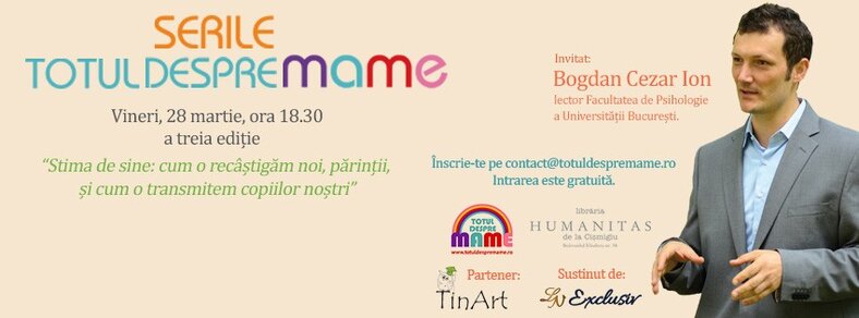 Vineri, 28 martie, are loc o nouă ediție a Serilor TDM la Librăria Humanitas de la Cişmigiu. Vom discuta cu Bogdan Cezar Ion, lector la Facultatea de Psihologie, despre stima de sine a părinților, dar și a copiilor: cum ne-o recâștigăm noi, adulții, și cum o cultivăm la copiii noștri.