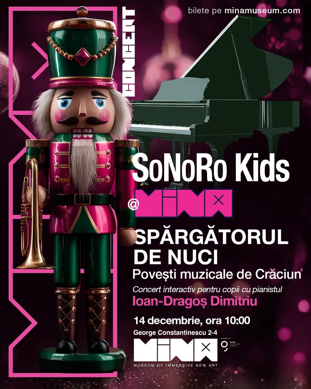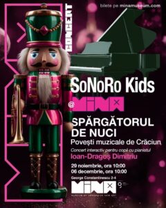 🎶 Pe 29 noiembrie, 6 decembrie si 14 decembrie, ora 10:00, te așteptăm la MINA, cu o serie de concerte pentru toată familia! Concertele sunt susținute de Ioan Dragoș Dimitriu, pianist de renume internațional – dedicat copiilor, construit în jurul universului muzical al Spărgătorului de Nuci.