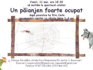 Vineri, 11 mai, ora 18.30, vă invităm la spectacol-atelier “Un păianjen foarte ocupat”, după povestea lui Eric Carle, recomandat copiilor cu vârste între 1-4 ani.
