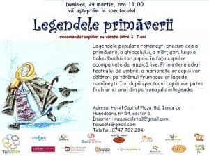 Va invitam sa descoperim legendele populare româneşti despre primavara, despre ghiocel, legenda mărţişorului şi a babei Dochia. Povestile pline de farmec vor poposi în faţa copiilor acompaniate de muzică live. Cu ajutorul teatrului de umbre si a marionetelor copiii vor călători pe tărâmul frumoaselor legede româneşti. Iar după spectacol copiii vor putea fi chiar ei unul din personajele din legende.
