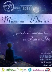 La ceas de seară, căzută de pe cerul înstelat, Doamna Luna ne șoptește povestea minciunii albastre desprinsă din peripețiile lui Relu și Filip. Cei doi frați, îndrumați de un prieten neobișnuit, pornesc într-o aventură în care doar adevărul îi mai poate salva, pe ei si pe părinții lor, de albăstreala buclucașă. O poveste presărată cu teatru de umbre, puțină aventură, teatru de păpuși, și un strop de magie…