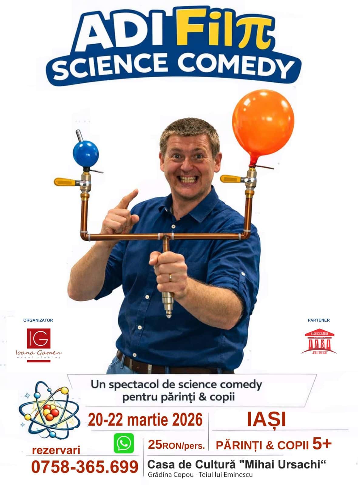 Primul show de Stand-Up Science Comedy din regiune. Experimente spectaculoase, umor și adrenalină — pentru toți, de la 5 la 100 de ani. Adi Filpișan — omul din spatele Muzeului Iluziilor și al Primului Planetariu Mobil din România — revine la Iași cu un format cu totul nou, pe care nu l-ai mai văzut niciunde.