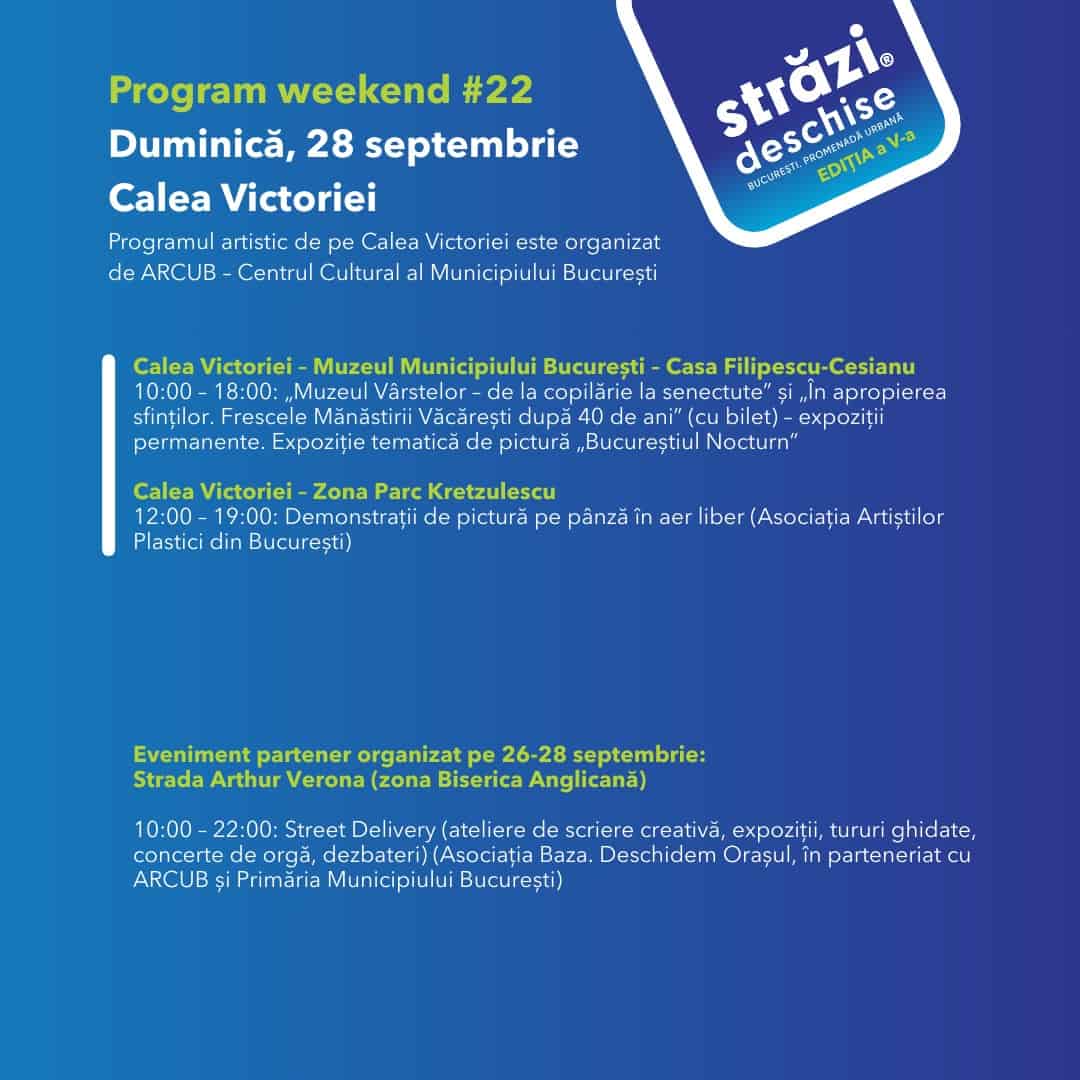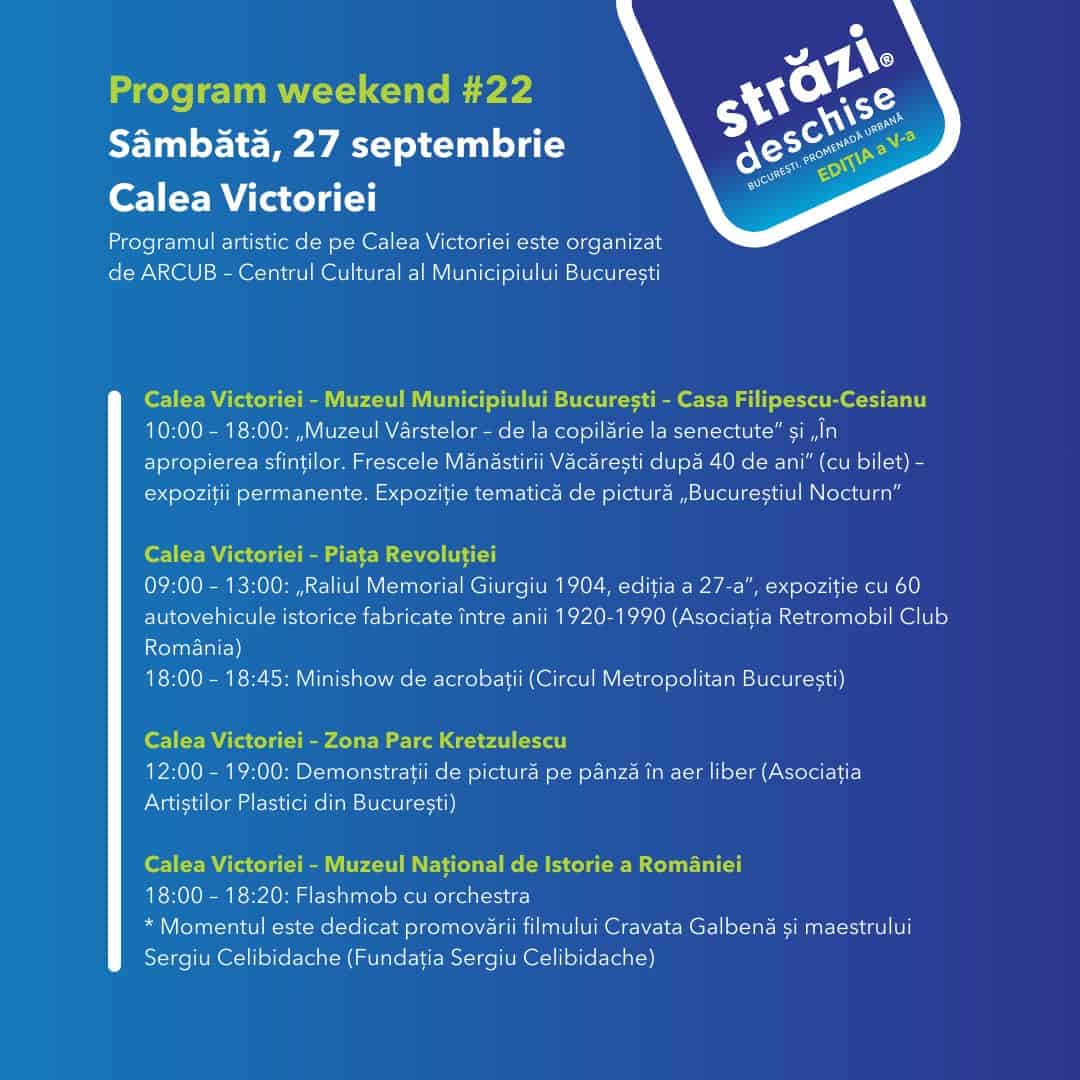Ne revedem în acest weekend la Străzi deschise – București, evenimentul care transformă orașul într-o mare scenă culturală și comunitară. Calea Victoriei devine promenadă pietonală cu expoziții, spectacole și demonstrații artistice în aer liber, de la acrobațiile Circului Metropolitan în Piața Revoluției, până la un flashmob muzical dedicat maestrului Sergiu Celibidache. În Sectorul 3, strada Râmnicu Vâlcea se transformă în loc de joacă și întâlnire pentru comunitate, cu spectacole de teatru pentru copii, ateliere, animații stradale, jocuri sportive și concerte susținute de Școala de Artă București.