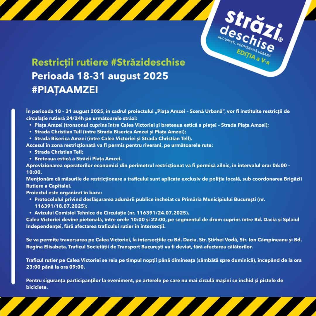 În perioada 18 – 31 august 2025, în cadrul proiectului „Piața Amzei – Scenă Urbană” (parte din #StrăziDeschise), zona Pieței Amzei devine 100% pietonală, 24/24h.