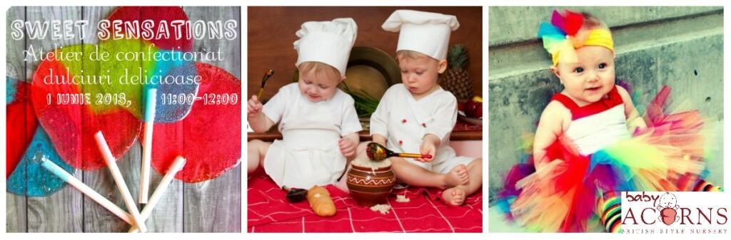 E colorat, amuzant si… dulce! Vom face impreuna (printre altele) sandwich de biscuiti de casa cu pasta de gem si branza, acadele din zahar ars pe care vom lipi bombonele colorate, vom coace forme din aluat pe care apoi le vom orna cu degetele mici si multe alte surprize delicioase.