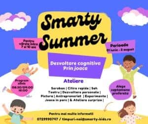 Tabăra urbană Smarty Summer le oferă copiilor ocazia de a experimenta activități și domenii interesante, cu scopul de a-i sprijini în a se cunoaște mai bine, în identificarea de noi pasiuni sau vocații. În același timp este un prilej pentru cei mici de a petrece timpul într-un mod dinamic, împreună cu alți copii, bucurându-se de activități deopotrivă creative și distractive.