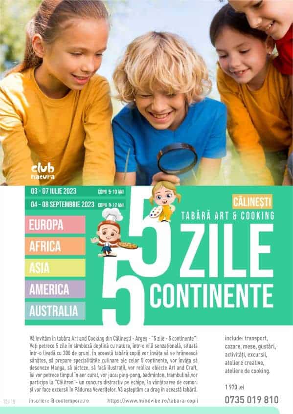 În taberele Art and Cooking ”5 zile – 5 continente” veți petrece clipe minunate în simbioză deplină cu natura din Călinești, într-o vilă senzațională, situată într-o livadă cu 300 de pruni. În această tabără veți învăța să vă hrăniți sănătos de la un specialist acreditat în nutriția sănătoasă. Veți învăța să preparați specialitățile culinare ale celor 5 continente, veți învăța să desenați Manga, să pictați, să faceți ilustrații, să realizați obiecte Art and Craft. Veți juca: ping-pong, badminton, trambulină, vor participa la ”Călitron”- un concurs distractiv pe echipe, veți face o vânătoare de comori și excursii în Pădurea Veverițelor. Te așteptăm într-un loc în care natura e la ea acasă.
