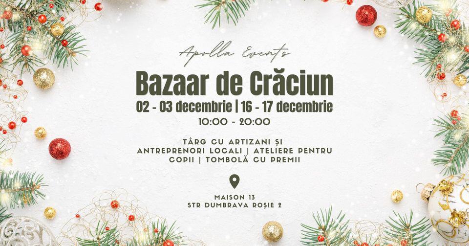 Avem plăcerea de a vă invita pe 02-03 și 16-17 Decembrie la 🎄 Bazaar de Crăciun 🎄, o ediție specială de sărbători în cadrul căreia vom găzdui ultimele noastre două târguri din acest an într-un cadru de basm. Suntem nerăbdători să descoperiți ce creații minunate au pregătit expozanții noștri pentru acest Crăciun.