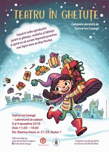 Derulată în weekendul 3-4 decembrie 2016, orele 11:00-19:00 la Teatrul Ion Creangă – Sala Mică, spațiu transformat cu această ocazie într-un Laborator de cadouri, campania vine în sprijinul a peste 80 de copii cu vârsta cuprinsă între 3 luni și 15 ani, care provin din familii aflate în stradă.
