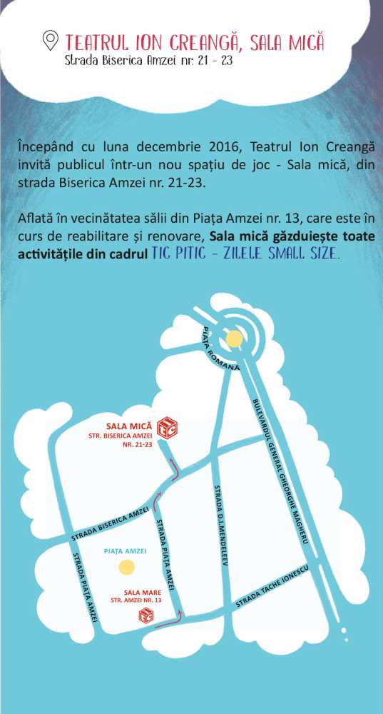 Toate activitățile din cadrul programului TIC PITIC – Zilele Small Size se desfășoară în noul spațiu de joc al Teatrului Ion Creangă – SALA MICĂ – aflat pe Str. Biserica Amzei, nr. 21-23 (în vecinătatea sălii din Piața Amzei nr 13, care este în curs de reabilitare și renovare).