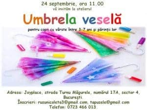 Pe 24 septembrie, ora 11:00, vă invităm la atelierul „Umbrela veselă”, pentru copii cu vârste între 3-7 ani şi părinţii lor.