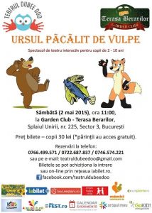 Teatrul Dubee Doo a fost invitat să joace și sâmbătă, 2 mai 2015, de la ora 11.00, la Terasa Berarilor (Splaiul Unirii, nr. 255, sector 3, București). Pe o scenă în aer liber, terasa se va transforma într-un tărâm de poveste, în care actorii Teatrului Dubee Doo vor da viață personajelor din povestea “Ursul păcălit de vulpe”, într-o adaptare după povestea cu același titlu scrisă de Ion Creangă.