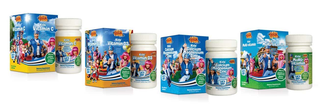 - LazyTown Kids’ Vitamin D3 – sunt tablete masticabile de vitamina D3 (colecalciferol), într-o formulă special creată pentru copii cu gust de lămâie din extracte naturale. Vitamina D3 este recomandată în special în sezonul rece, atunci când expunerea deficitară la soare face dificilă producerea acestei vitamine la nivelul pielii. Vitamina D3 are un rol esenţial în metabolizarea şi asimilarea calciului şi a fosforului, minerale importante în menţinerea sănătăţii sistemului osos şi a dentiţiei. Această vitamină mai are un rol decisiv în întărirea sistemului imunitar, lupta împotriva răcelii şi a gripei.